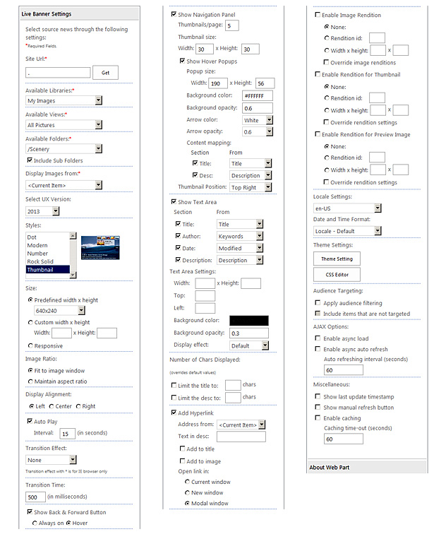The FireArrow’s Live Banner 2.0 Web Part offers an effortless way to manage and display live banners in SharePoint Sites. There are many improvements going in to the new version, including new design, enhanced transition effects, AJAX support, CSS customization, theme configuration (WYSIWYG), image rendition and audience targeting.