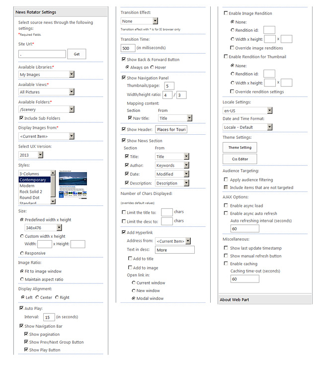 FireArrow News Rotator V2.0 Web Part enables you to display headline news stories easily. It is a massive improvement from the 1.0 version. The new version offers a lot new features such as updated display styles, flexible configurations, new transition effects, customization support, AJAX support, image aspect ratio support, caching and audience targeting.
